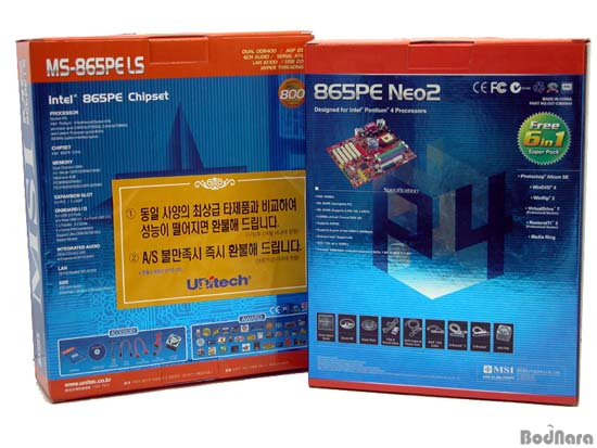 À¯´ÏÅØ MS-865PE LS¿Í MSI 865PE NEO2ÀÇ ¹Ú½º ¿·¸é µðÀÚÀÎ. À§°¡ À¯´ÏÅØ MS-865PE LS, ¾Æ·¡°¡ MSI 865PE NEO2-LS
