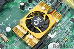 EPoX EP-9NPAJÀÇ Ä¨¼Â¿¡´Â ¹æ¿ÆÇ¸¸ÀÌ ¾Æ´Ñ Ä𷯵µ ÇÔ²² Á¦°øµÇ´Â ¹æ½ÄÀÇ Äð¸µÀ» ¼±ÅÃÇÏ¿© »ç¿ëÇϰí ÀÖ´Ù. ÀÌ Äð·¯´Â nForce3 250GbÀÇ Ãâ½Ã¿Í ¶§¸¦ ¸ÂÃß¾î ÇÔ²² Á¦°øµÇ¾ú´ø °ÍÀ¸·Î nForce4 Ĩ¼Â¿¡µµ »ç¿ëµÇ¾ú´Ù. AMD Athlon64 CPU¿¡ ¸Þ¸ð¸®°¡ ³»ÀåµÇ¾î °¡´ÉÇØÁø ½Ì±Û Ĩ¼Â ±¸Á¶¸¦ ÀÌ¿ëÇÏ´Â nForce4 Ĩ¼ÂÀÇ °æ¿ì ÇϳªÀÇ Ä¨¼Â¿¡¼ ´ëºÎºÐÀÇ ±â´ÉÀÌ ÅëÇյǾúÀ¸¹Ç·Î ¹ß»ýµÇ´Â ¹ß¿À» ºü¸£°Ô ½ÄÇôÁÖ±â À§ÇØ Àû¿ëÇÑ Äð·¯ÀÌ´Ù. ±Ý»ö µµ±ÝµÈ È÷Æ®½ÌÅ©¿Í Äð·¯ Áß°£¿¡ À§Ä¡ÇÑ EpoX ·Î°í°¡ ÀλóÀûÀÌ´Ù.