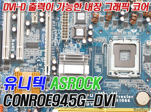 ¸ÕÀú »ìÆìº¼ Asrock ConRoe945G-DVI´Â ±×·¡ÇÈ ³»Àå ÄÚ¾îÀÎ 945G¸¦ »ç¿ëÇØ ÃֽŠÀÎÅÚ CPUÀÎ Core 2 Duo¸¦ Áö¿øÇÏ´Â Micro-ATX ¸ÞÀκ¸µåÀÌ´Ù. ÀÎÅÚ 945G¿Í ICH7ÀÌ »ç¿ëµÇ¿¡ LGA775 ¼ÒÄÏ¿¡ ¼³Ä¡ÇÒ ¼ö ÀÖ´Â CPU¸¦ Áö¿øÇϸç, DDR2-667ÀÇ ¸Þ¸ð¸®¸¦ 4°³ÀÇ DIMM¿¡ ÃÖ´ë 4GB±îÁö ¼³Ä¡ÇÒ ¼ö ÀÖÀ¸¸ç, 4°³ÀÇ SATA II Æ÷Æ®¿Í ÃÖ´ë 8°³ÀÇ USB 2.0À» Áö¿øÇÑ´Ù.