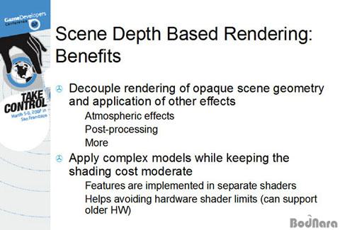À̸¦ À§ÇØ Å©¶óÀÌÅØÀÌ µµÀÔÇÑ °ÍÀº Scene Depth Based Rendering À̶ó´Â ±â¼ú·Î À̰ÍÀº ÇöÀçÀÇ ½ÃÁ¡¿¡¼­ ½Ã¾ßÀÇ ½Éµµ°ª(Z°ª)À» ¹Ì¸® °è»êÇÏ¿© ÀÌ °ªÀ» ÀÌ¿ëÇØ ¿©·¯ °¡Áö ÇÁ·Î¼¼½º¸¦ ÁøÇàÇÏ´Â °ÍÀ» ±âº» ¹æÄ§À¸·Î Çϰí ÀÖ´Ù.