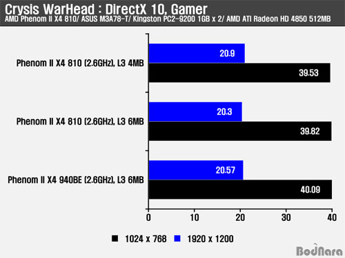 Crysis WarHead¿¡¼´Â L3 ij½¬ 4MB¿Í 6MB ¼³Á¤ »çÀÌÀÇ ¼º´É Â÷À̰¡ ÀúÇØ»óµµ¿¡¼´Â 1fpsº¸´Ù ³·°Ô ³ªÅ¸³µ°í ±×·¡ÇÈ Ä«µåÀÇ ¿µÇâÀÌ ÀÖ´Â °íÇØ»óµµ´Â ¿ÀÈ÷·Á L3 4MBÀÇ ¼º´ÉÀÌ ¾à°£ ´õ ³ô°Ô ³ªÅ¸³µ´Ù.