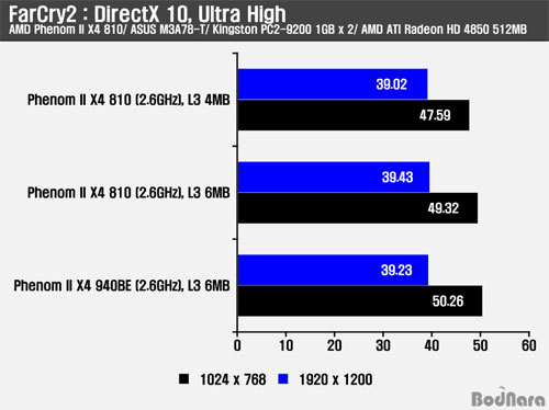 FarCry2´Â ¾Õ¼ÀÇ Crysis WarHead¿Í ´Þ¸® CPUÀÇ Ã³¸® ºñÁßÀÌ ³ôÀº 1024 x 768 ÇØ»óµµ¿¡¼ L3 ij½¬ 6MB ¼³Á¤ÀÌ ¾à 2pfs °¡·® Çâ»óµÈ ó¸® ¼º´ÉÀ» º¸¿©ÁØ´Ù.