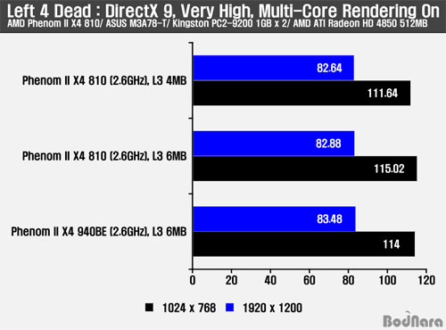 Left 4 Dead´Â ÇÏÇÁ¶óÀÌÇÁ ¼Ò½º¿£Áø ±â¹ÝÀ¸·Î CPUÀÇ ÀÇÁ¸µµ°¡ ºñ±³Àû ³ô¾Æ L2/ L3 ij½¬ÀÇ ¼º´É Â÷À̰¡ Å©°Ô ³ªÅ¸³¯ °ÍÀ¸·Î ¿¹»óµÇ´Âµ¥ CPUÀÇ ¿µÇâÀÌ Å« 1024 x 768 ÇØ»óµµ¿¡¼ L3 ij½¬°¡ 6MB ¼³Á¤µÈ »óȲ¿¡¼ ¾à 4-5fps Á¤µµ ´õ ³ôÀº ¼º´ÉÀÌ ³ªÅ¸³ª°í ÀÖ´Ù.