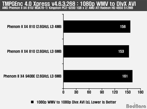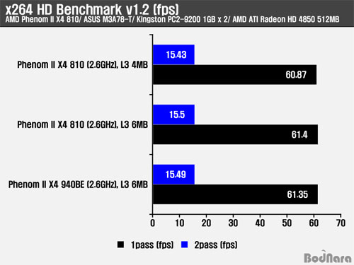 ÀÎÄÚµù ¼º´ÉÀº TMPGEnc 4.0 Xpress¿Í x264 HD Benchmark¸¦ ÀÌ¿ëÇÏ¿© DivX ÄÚµ¦°ú x264 ÄÚµ¦À» °¢°¢ »ç¿ëÇÏ¿´À» ¶§ÀÇ È¯°æ¿¡¼ L3 ij½¬ ¿ë·®¿¡ µû¸¥ ¼º´ÉÀ» ºñ±³Çß´Ù. Æä³Ñ2 X4 810Àº 4MB¿Í 6MB ¼³Á¤¿¡¼´Â 3ÃÊÀÇ Â÷À̸¦, Æä³Ñ2 X4 940BE L3 6MB ¼³Á¤¿¡¼´Â ¿ÀÈ÷·Á 5Ãʰ¡·® ´À¸° ¼º´ÉÀ» º¸¿©Áá´Ù. x264 HD Benchmark¿¡¼ÀÇ Ã³¸® ¼º´ÉÀº L3 6MB ¼³Á¤ÀÌ Àü¹ÝÀûÀ¸·Î ³ô°Ô ³ªÅ¸³µ´Ù.