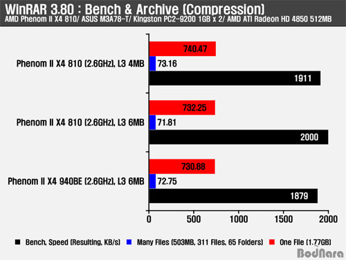 ¾ÐÃà ¼º´ÉÀº ¸ÖƼ ½º·¹µå¸¦ Áö¿øÇÏ´Â WinRAR 3.80 ¹öÀüÀ» ÀÌ¿ëÇÏ¿© º¥Ä¡¸¶Å©¿Í ½ÇÁ¦ ¾ÐÃàÀ» Æ÷ÇÔÇÏ¿© L3 ij½¬ ¿ë·®¿¡ µû¸¥ ¼º´É Â÷À̸¦ ºñ±³Çß´Ù. Å×½ºÆ® °á°ú Æä³Ñ2 X4 940BE´Â °°Àº ¼³Á¤¿¡¼ º¥Ä¡¸¶Å©¸¦ Á¦¿ÜÇÑ ½ÇÁ¦ Å×½ºÆ®¿¡¼´Â Æä³Ñ2 X4 810 L3 4MB ±¸¼ºº¸´Ù Çâ»óµÈ 󸮽ð£À» º¸¿©ÁÖ¸ç, Æä³Ñ2 X4 810 L3 6MB ¼³Á¤Àº º¥Ä¡¸¦ Æ÷ÇÔÇÑ ½ÇÁ¦ 󸮼º´É ¿ª½Ã Çâ»óÀÌ È®ÀεȴÙ.