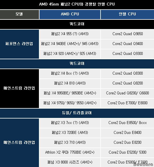 AMD¿¡¼ »õ·Ó°Ô ³»³õÀº 45nm °øÁ¤ Æä³Ñ2 CPUµé°ú °æÀïÇÏ´Â ÀÎÅÚ ¶óÀξ÷¿¡ ´ëÇÑ ³»¿ëÀ» AMD Vs ÀÎÅÚ. Æä³Ñ2 µîÀåÀ¸·Î º¯ÈÇÑ °æÀï ¶óÀξ÷ Á¤È®È÷ ÆÄ¾ÇÇϱ⠱â»ç¸¦ ÅëÇØ ¼Ò°³Çصå·È´Ù.