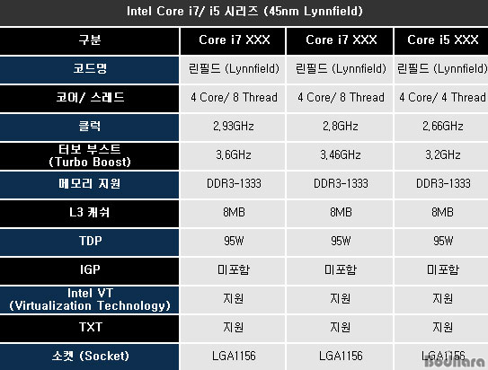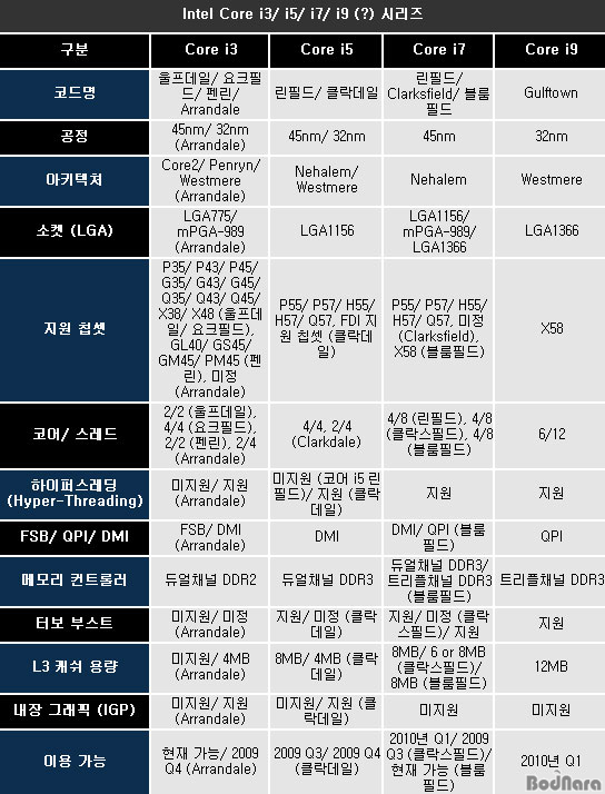 ¶ÇÇÑ, ÄÚ¾î i7 ÄÚµå¸í ºí·ëÇʵ忡´Â ÇöÀç X58 Ĩ¼ÂÀÌ »ç¿ëµÇ°í ÀÖÀ¸¸ç, ÄÚ¾î i5 ¸°Çʵå´Â P55/ P57 µîÀÇ Ä¨¼ÂÀÌ »ç¿ëµÉ °ÍÀ¸·Î ¾Ë·ÁÁö°í ÀÖ¾î Áö¿ø Ĩ¼Â¿¡µµ Â÷À̸¦ º¸ÀδÙ.
