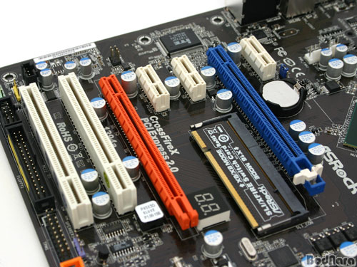 È®Àå½½·ÔÀº PCI-Express 2.0 x16 ½½·Ô 2°³, PCI-Express x1 ½½·Ô 3°³, PCI ½½·Ô 2°³¸¦ Á¦°øÇϸç, 2°³ÀÇ PCI-Express 2.0 x16 ½½·ÔÀ» ÀÌ¿ëÇÏ¿© ´ë¿ªÆø x8, x8·Î µ¿ÀÛÇÏ´Â Å©·Î½ºÆÄÀÌ¾î ±¸¼ºÀÌ °¡´ÉÇÏ´Ù. Å©·Î½ºÆÄÀ̾îX ±¸¼º½Ã ÆÄ¶õ»ö PCI-Express 2.0 x16 ½½·Ô ÁÂÃø¿¡ À§Ä¡ÇÑ ½ºÀ§Ä¡ Ä«µå¸¦ º¯°æÇØ ÁÖ¾î¾ß Çϴµ¥, À̰ÍÀº 2°³ÀÇ PCI-Express 2.0 x16 ½½·Ô¿¡ ±×·¡ÇÈ Ä«µå¸¦ ÀåÂøÇÏ´Â °Í¸¸À¸·Î Å©·Î½ºÆÄÀ̾ ±¸¼ºÇÒ ¼ö ÀÖ´Â ´Ù¸¥ ¸ÞÀκ¸µå¿Í ºñ±³ÇØ ¾Æ½¬¿î ºÎºÐÀÌ´Ù.