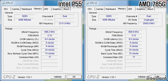 ºñ±³ ´ë»óÀ¸·Î »ç¿ëÇÑ ÀÎÅÚ ¸°ÇÊµå ½Ã½ºÅÛ(P55)°ú AMD ½Ã½ºÅÛ(785G) ¸ðµÎ µà¾ó ä³Î DDR3-1333 ¸Þ¸ð¸®·Î µ¿ÀÛÇÏ¸ç ±âº» ¸Þ¸ð¸® ŸÀ̹ÖÀº CL9-9-9·Î µ¿ÀÏÇÏÁö¸¸ ¼¼ºÎ ŸÀְ̹ú Ä¿¸ÇÆ® ·¹ÀÌÆ®°¡ Ŭ¶ôµ¥ÀÏ ½Ã½ºÅÛ°ú ´Ù¸£°Ô ÀâÈù´Ù.