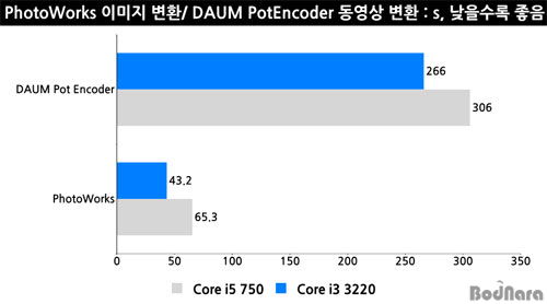 Å×½ºÆ® °á°ú Æ÷Åä¿÷½º·Î À̹ÌÁö º¯È¯ ½Ã ÄÚ¾î i3 3220 ½Ã½ºÅÛÀÌ ÄÚ¾î i5 750 ½Ã½ºÅÛº¸´Ù ¾à 20ÃÊ °¡·® »¡¸® º¯È¯ ÀÛ¾÷À» ¿Ï·áÇßÀ¸¸ç, µ¿¿µ»ó º¯È¯ ½Ã°£ÀÇ °æ¿ì¿¡´Â ¾à 40ÃÊ °¡·® ÄÚ¾î i3 3220 ½Ã½ºÅÛÀÌ »¡¸® ÀÛ¾÷À» ³¡³¾ ¼ö ÀÖ¾ú´Ù.