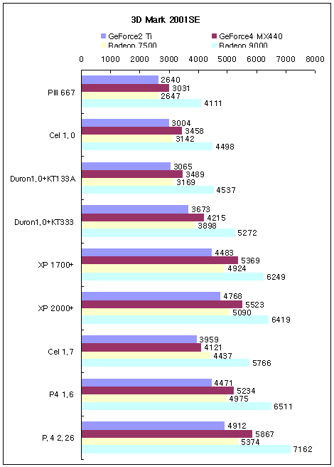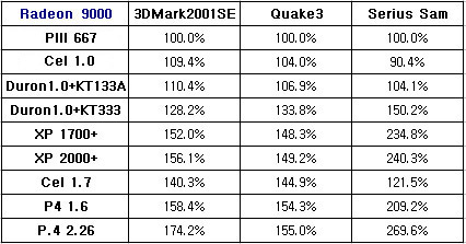 Radeon9000¿ª½Ã Radeon7500°ú ¸¶Âù°¡Áö·Î OpenGLÀ» »ç¿ëÇÏ´Â ÇÁ·Î±×·¥¿¡¼­ÀÇ ¼º´ÉÂ÷À̰¡ D3D¸¦ »ç¿ëÇÏ´Â ÇÁ·Î±×·¥º¸´Ù Àû¾ú´Ù. Radeon9000¿¡ ÃßõÇÏ´Â Á¶ÇÕÀº P4 1.6Á¤µµ¸é ÃæºÐÇÒ µí ½Í´Ù. ÇÏÁö¸¸, Á¦´ë·ÎµÈ ¼º´ÉÀ» ÃÖ´ë·Î ²ø¾î³»·Á¸é, P4 2.26Á¤µµÀÇ ½Ã½ºÅÛµµ ±¦ÂúÀ» °ÍÀÌ´Ù.