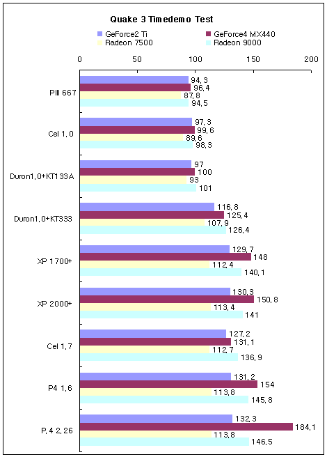 Quake3¿¡¼­´Â ±×´ÙÁö ¸¹Àº Â÷À̰¡ ³ªÅ¸³ªÁö ¾Ê´Â´Ù. ±âº»ÀûÀÎ ½Ã½ºÅÛ ¼º´ÉÂ÷ÀÌ·Î Á¶±Ý¾¿ÀÇ Â÷À̸¸ ³ªÅ¸³­´Ù. OpenGLÀ» »ç¿ëÇÏ´Â ÇÁ·Î±×·¥Àº ½Ã½ºÅÛº¸´Ù´Â ±×·¡ÇÈÄ«µåÀÇ ¿µÇâÀÇ ´õ ¸¹ÀÌ ¹Þ´Â µí ÇÏ´Ù. ÇÏÁö¸¸ GeForce4 MX440À» º¸¸é P4 2.26¿¡¼­ ÇÁ·¹ÀÓ¼ö°¡ ÆÅ ¿Ã¶ó°¡´Â°É º¼ ¼ö ÀÖ´Ù. ÇÏÁö¸¸, ¶óµ¥¿Â 7500ÀÇ °æ¿ì 2.26°ú XP1700+¿¡¼­ÀÇ ÇÁ·¹ÀÓÀÌ °ÅÀÇ °°Àº°É·Î º¸¾Æ XP1700+¸é ÃÖ´ë ¼º´ÉÀ» ¹ßÈÖÇÒ ¼ö ÀÖ´Ù.