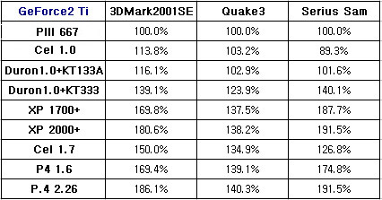 GeForce2 TiÀÇ µ¥ÀÌÅ͸¦ ºÐ¼®ÇÑ µµÇ¥ÀÌ´Ù. Serius SamÀ» ±âÁØÀ¸·Î ÃÖ´ë µÎ¹è¿¡ °¡±î¿î ¼º´ÉÂ÷À̰¡ ³ªÅ¸³µ´Ù. OpenGLÀ» »ç¿ëÇÏ´Â ÇÁ·Î±×·¥º¸´Ù D3D¸¦ »ç¿ëÇÏ´Â ÇÁ·Î±×·¥¿¡¼­ ¸¹Àº ¼º´ÉÂ÷À̸¦ º¸¿´´Ù. ºÐ¼®À» ÇØº¸¸é XP1700+½Ã½ºÅÛ°ú ±× ÀÌÇÏÀÇ ½Ã½ºÅÛ¿¡¼­ ¸¹Àº ¼º´ÉÂ÷°¡ ³µ°í, XP1700+Á¤µµÀÇ ½Ã½ºÅÛÀ» »ç¿ëÇϸé, GeForce2 Ti¸¦ È¿À²ÀûÀ¸·Î »ç¿ëÇÒ ¼ö ÀÖ´Ù.