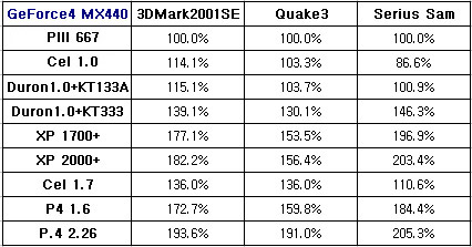 GeForce4 MX440ÀÇ °æ¿ì DDR½Ã½ºÅÛ°ú SDR½Ã½ºÅÛ¿¡¼­ ¸¹Àº Â÷À̰¡ ³µ´Ù. ¶ÇÇÑ, º¸±ÞÇü ½Ã½ºÅÛ°ú °í±ÞÇü ½Ã½ºÅÛ »çÀÌ¿¡¼­ Å« ¼º´ÉÂ÷À̰¡ ³ªÅ¸³µ´Ù. GeForce4 MX440À» Á¦´ë·Î »ç¿ëÇÏ·Á¸é, P4 1.6ÀÌ»óÀÇ ½Ã½ºÅÛ. ÃÖÀûÈ­¸¦ À§Çؼ± XP2000+Á¤µµÀÇ ½Ã½ºÅÛ »ç¿ëµµ °í·ÁÇØº¼ ¼ö ÀÖ´Ù.