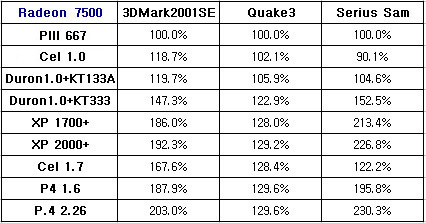Radeon7500 ¿ª½Ã DDR°ú SDR ½Ã½ºÅÛ»çÀÌ¿¡¼­ Å« Â÷À̸¦ º¸¿´´Ù. 2¹è°¡ ³Ñ´Â ¼º´ÉÂ÷À̸¦ º¸ÀÌ´Â ÇÁ·Î±×·¥µµ ÀÖ´Â°É º¼ ¼ö ÀÖ´Ù. Radeon7500ÀÇ °æ¿ì OpenGLÀ» »ç¿ëÇÏ´Â ÇÁ·Î±×·¥¿¡¼­´Â ½Ã½ºÅÛ°£ ¸¹Àº Â÷À̸¦ ³ªÅ¸ ³»Áö ¾Ê¾Ò´Ù. Radeon7500ÀÇ ÀûÀýÇÑ ½Ã½ºÅÛ ¿ª½Ã XP1700+ÀÌ»óÀÇ Á¶ÇÕÀÌ ¾Æ´Ò±î...