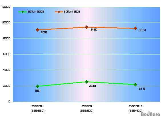 ¼º´ÉÀ» º¸ÀÌ´Â °ÍÀÌ´Ù. ¹°·Ð µÎ ´Ü°è³ª ÇÏÀ§ GPUÀÎ FX5200Àº ³ôÀº Ŭ·°¿¡µµ ºÒ±¸Çϰí FX5700LEÀÇ ¿£ÁøÀ» µû¶óÀâÀ» ¼ö´Â