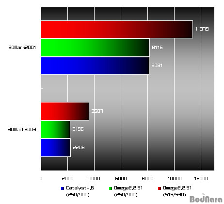 ÀÌ·ç¾îÁ³À½À» º¼ ¼ö ÀÖ´Ù. 3DMark2003¿¡¼ 68%¿¡ ´ÞÇÏ´Â ¼º´É Çâ»ó, 3DMark2001¿¡¼ 40%¿¡ ´ÞÇÏ´Â ¼º´É Çâ»óÀ»