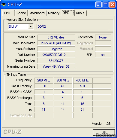 CPU-Z Á¤º¸¸¦ ÅëÇØ È®ÀÎÇÑ kingston HyperX KHX9600Àº JEDEC¿¡¼­ ÀÎÁ¤ÇÏ´Â °ø½Ä ±Ô°ÝÀÎ PC2-6400 (400MHz)·Î ÀνĵǸç, ÆÄÆ®³Ñ¹ö´Â KHX8500D2/512·Î ÀνĵǾîÁö°í ÀÖ´Ù. ¸Þ¸ð¸® Ŭ·°µµ ÀÌ¿¡ ¸ÂÃß¾î DDR2 400MHz¿¡¼­´Â CL3-3-3-8, DDR2 533MHz¿¡¼­´Â CL4-4-4-11, DDR2 800MHz¿¡¼­´Â CL5-5-5-16·Î ÀνĵǾîÁö°í ÀÖ´Ù.