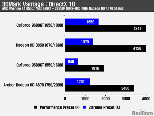 DirectX 10 ȯ°æÀÇ GPU ¼º´ÉÀ» Å×½ºÆ®ÇÏ´Â 3DMark Vantage¿¡¼­´Â ·¹ÆÛ·±½º¿Í µ¿ÀÏÇÑ Å¬·°À» °¡Áø ¸¸Å­ ·¹ÆÛ·±½º ±×´ë·ÎÀÇ ¼º´ÉÀ» È®ÀÎÇÒ ¼ö ÀÖÀ¸¸ç, ÀÌÀü AMD Æä³Ñ X4 9550 ½Ã½ºÅÛ¿¡¼­ »ìÆìº» HD 4670 ·¹ÆÛ·±½ºÀÇ ¼º´ÉÀº °æÀï Á¦Ç°ÀÎ GeForce 9500GT¸¦ °¡º±°Ô ³Ñ¾î¼­°í ºñ½ÁÇØÁø °¡°Ý´ëÀÇ 256bit ¸Þ¸ð¸® ÀÎÅÍÆäÀ̽º¸¦ °¡Áø HD 3850°ú GeForce 9600GT¿¡ ±ÙÁ¢ÇÑ ¼º´ÉÀ» Á¦°øÇÑ´Ù.