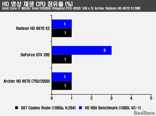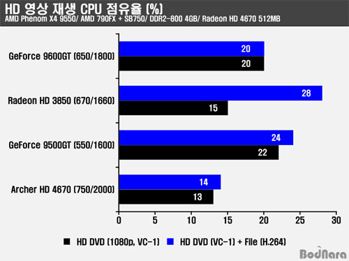 HD ¿µ»ó Àç»ýÀº ÄÚ¾î i7 965XE ½Ã½ºÅÛÀº ÇÏÀÌÆÛ½º·¹µùÀ» Áö¿øÇÏ¿© ³í¸® ÄÚ¾î 4°³°¡ Ãß°¡µÇ¾î 8°³ÀÇ Äھ Áö¿øÇϰí HD 4670ÀÇ °æ¿ì UVD2¸¦ Áö¿øÇϱ⠶§¹®¿¡ À̸¦ Á¶ÇÕÇÒ °æ¿ì H.264¿Í VC-1 ŸÀÌÆ² ¸ðµÎ¿¡¼­ 1% ³»¿ÜÀÇ CPU Á¡À¯À² Á¦°øÇÑ´Ù. VC-1 °¡¼ÓÀÇ °æ¿ì °æÀï»çº¸´Ù ´õ ³ªÀº CPU Á¡À¯À²À» Á¦°øÇÑ´Ù. AMD Æä³Ñ X4 9550 ½Ã½ºÅÛ¿¡¼­´Â VC-1°ú H.264 ÆÄÀÏ µ¿½Ã Àç»ý¿¡¼­µµ HD 4670Àº UVD2¸¦ ÀÌ¿ëÇÏ¿© ´õ ³·Àº CPU Á¡À¯À²À» Á¦°øÇÑ´Ù.