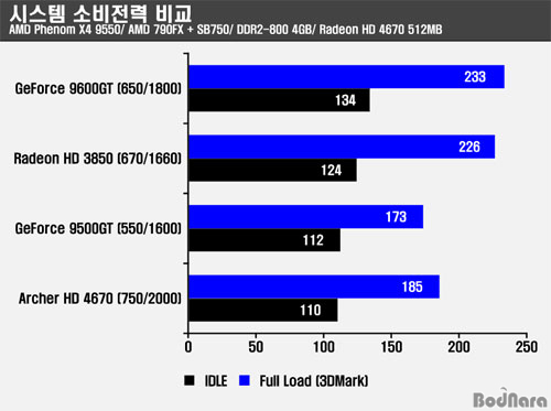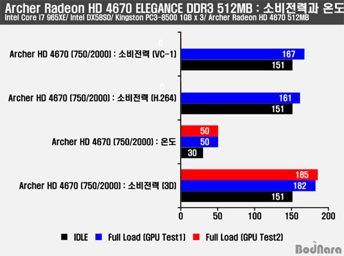 ¾ÆÃ³ÅØ Radeon HD 4670Àº ÀÛÀº Å©±âÀÇ Ä𷯸¦ °¡Áö°í ÀÖÀ½¿¡µµ 50µµ ³»¿ÜÀÇ ¿Âµµ¸¦ º¸¿©ÁÖ¾ú°í Full Load »óȲ¿¡¼­ 185W ³»¿ÜÀÇ ¼ÒºñÀü·ÂÀ» º¸¿©ÁÖ°í ÀÖ¾î °í¼º´É ±×·¡ÇÈ Ä«µåµé°ú Â÷À̸¦ º¸¿©ÁÖ°í ÀÖ´Ù. ¶Ç, °æÀï Á¦Ç°À¸·Î ¾Ë·ÁÁø GeForce 9500GTº¸´Ù ³·Àº ¼ÒºñÀü·ÂÀ» Á¦°øÇϸç, ³ôÀº ¼º´ÉÀ» Á¦°øÇÑ´Ù.
