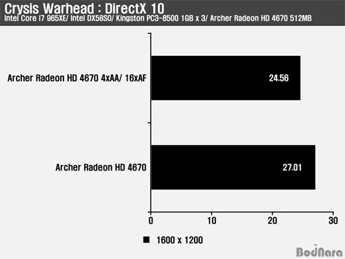 ÀÎÅÚ ÄÚ¾î i7 965XE ±â¹Ý ½Ã½ºÅÛ¿¡¼­ ÁøÇàµÈ Crysis Warhead´Â ±×·¡ÇÈ ¼³Á¤À» ¸ÞÀνºÆ®¸² (Mainstream)¿¡ ¸ÂÃß¾î Å×½ºÆ®¸¦ ÁøÇàÇÑ °á°ú·Î 1600 x 1200 ÇØ»óµµ¿¡¼­´Â 30fps ÀÌÇÏÀÇ ¼º´ÉÀ» º¸¿©ÁÖ°í ÀÖÀ¸¹Ç·Î ÇØ»óµµ¸¦ ÁÙÀ̰ųª ¿É¼ÇÀ» ´õ ³·Ãß¾î °ÔÀÓÀ» ÁøÇàÇÒ ¼ö ÀÖ´Ù. ÀÌÀü AMD Æä³Ñ2 X4 9550ÀÇ Å×½ºÆ® °á°ú¿¡¼­´Â ÀúÇØ»óµµ¿¡¼­´Â 30fps¸¦ ³Ñ¾î Ç÷¹À̰¡ °¡´ÉÇØÁö¸ç, 1600 x 1200¿¡¼­ 256bit ¸Þ¸ð¸® ÀÎÅÍÆäÀ̽º¸¦ °¡Áø GeForce 9600GT¸¦ ±Ù¼ÒÇÑ Â÷ÀÌ·Î ¾Õ¼­±âµµ Çß´Ù.
