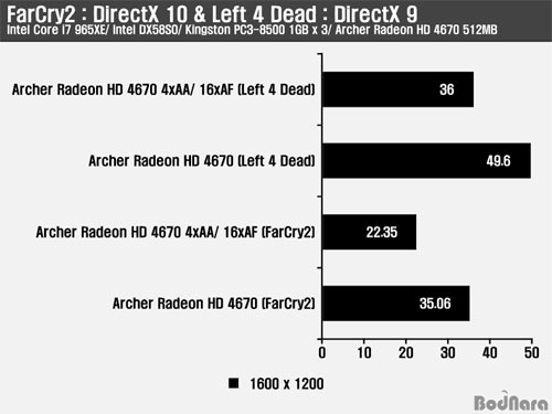 Left 4 Dead´Â ÇÏÇÁ¶óÀÌÇÁ ¼Ò½º¿£ÁøÀ» ±â¹ÝÀ¸·Î ¸¸µé¾îÁø °ÔÀÓÀ¸·Î DirectX 9 ȯ°æÀÇ Å×½ºÆ®¸¦ ÁøÇàÇϸç, ¼³Á¤ ¿É¼ÇÀº °¡Àå ³ôÀº ¼³Á¤À» Àû¿ëÇÑ ÈÄ Å×½ºÆ®¸¦ ÁøÇàÇß´Ù. FarCry2´Â Very High ¿É¼Ç ¼³Á¤À¸·Î º¥Ä¡¸¶Å© ÅøÀÇ Ranch SmallÀ» 2ȸ ¹Ýº¹ Å×½ºÆ®ÇÑ ÈÄÀÇ °á°ú´Ù. Å×½ºÆ® ÇØ»óµµ´Â 1600 x 1200ÀÇ ÇØ»óµµÀ̸ç, 4xAA/ 16xAF¸¦ Àû¿ëÇÑ °á°úµµ Æ÷ÇÔÇÏ¿´´Ù.