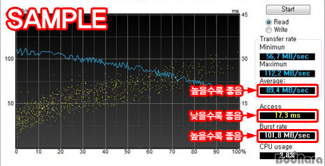 ÀϹÝÀûÀ¸·Î ¼ø°£ ÃÖ´ë Àü¼Û ¼ÓµµÀÎ ¹ö½ºÆ® ¼Óµµ°¡ Æò±Õ Àü¼Û ¼Óµµº¸´Ù ³ô¾Æ¾ß Çϴµ¥ Å×½ºÆ®¿¡ »ç¿ëµÈ HD Tune Pro 3.0¿¡¼­ AHCI ¸ðµå¸¦ Á¦´ë·Î Áö¿øÇÏÁö ¸øÇØ À̰°Àº °á°ú°¡ ¹ß»ýÇÏ´Â °ÍÀ¸·Î »ý°¢µÇ¸ç ¹ö½ºÆ® ¼Óµµ°¡ Çϵåµð½ºÅ©ÀÇ ¼º´ÉÀ» Àý´ëÀûÀ¸·Î Æò°¡ÇÒ ¼ö ÀÖ´Â ±âÁØÀº ¾Æ´Ï±â ¶§¹®¿¡ Âü°íÁ¤µµ·Î ºÁÁÖ±æ ¹Ù¶õ´Ù.