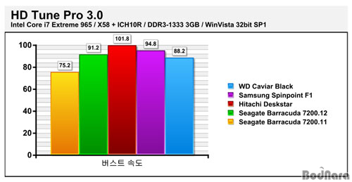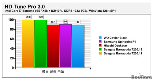 HD Tune Pro¸¦ ÅëÇÑ Æò±Õ Àü¼Û¼Óµµ Å×½ºÆ®¿¡¼­´Â 500GB Ç÷¡Å͸¦ »ç¿ëÇÑ ¹Ù¶óÄí´Ù 7200.12°¡ °¡Àå ³ôÀº Àü¼Û·üÀ» º¸¿´À¸¸ç, 333GB Ç÷¡Å͸¦ »ç¿ëÇÑ ¹Ù¶óÄí´Ù 7200.11ÀÌ Ç÷¡ÅÍ ¿ë·®ÀÇ Â÷ÀÌ¿¡µµ ºÒ±¸ÇÏ°í ±Ù¼ÒÇÑ Â÷ÀÌ·Î µÎ ¹øÂ°·Î ³ôÀº Àü¼Û·üÀ» º¸¿© ¹Ù¶óÄí´Ù Á¦Ç°±ºÀÌ ´Ù¸¥ Á¦Ç°¿¡ ºñÇØ ÃÊ´ç ¾à 10MB Á¤µµ ´õ ³ôÀº Àü¼Û·üÀ» º¸¿´´Ù.