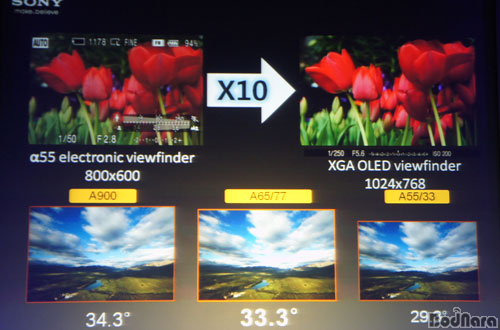À۳⠸ðµ¨ÀÎ A55/33¿¡ »ç¿ëµÈ EVF´Â 800x600 ÇØ»óµµ¸¦ Áö¿øÇÏ´Â TFT LCD¿´Áö¸¸, A77/65¿¡ µé¾î°£ XGA OLED´Â 1024x768 ÇØ»óµµ·Î º¸´Ù ¼±¸íÇØÁ³°í OLED ÆÐ³ÎÀ» ÅëÇØ »ö°¨°ú ¸í¾Ïºñµµ Çâ»óµÇ¾ú´Ù.