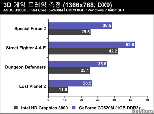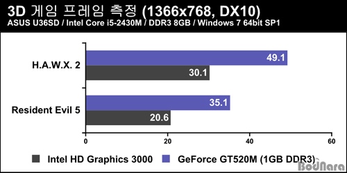 ±×·¡ÇÈ Ç׸ñÀÇ °æ¿ì GPU °¡¼Ó ºÎºÐÀÇ Å×½ºÆ®°¡ ÁÖ¸¦ ÀÌ·ç°í ÀÖ¾î GeForce GT520M°¡ ´ëºÎºÐ µ¿ÀÛÇÏ°Ô µÈ´Ù. °á°ú´Â 5.9/6.4Á¡À̶ó´Â ³ôÀº Á¡¼ö·Î 3D ¼º´ÉÀÌ ¿ä±¸µÇ´Â °ÔÀӵ鿡¼µµ ÃæºÐÈ÷ Áñ±æ ¼ö ÀÖÀ» ¸¸ÅÀÇ ¼º´ÉÀ» Á¦°øÇÔÀ» ¾Ë ¼ö ÀÖ´Ù.