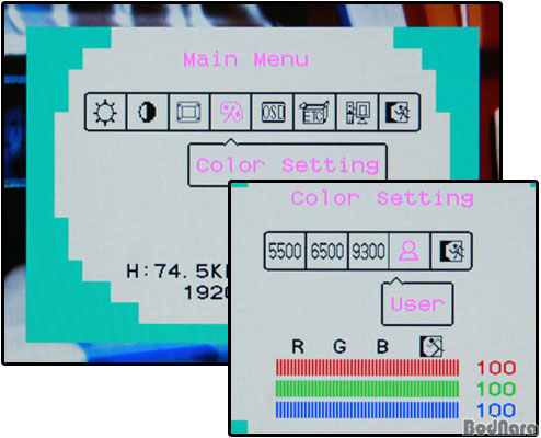 D-Sub(¾Æ³¯·Î±×)·Î ¿¬°áÇÒ °æ¿ì È­¸éÀÇ Å©±â ¹× À§Ä¡ ¼³Á¤(ÀÚµ¿¼³Á¤ Æ÷ÇÔ) ±â´ÉÀÌ È°¼ºÈ­ µÇ¸ç, HDMI(DVI Æ÷ÇÔ)·Î ¿¬°áÇÒ °æ¿ì È­¸é Á¶Àý Ç׸ñÀº ºñȰ¼ºÈ­ µÈ´Ù. »ö»ó ¼³Á¤Àº »ö ¿Âµµ¿¡ µû¸¥ 5500k, 6500k, 9300k·Î ³ª´µ¾îÁ® ÀÖÀ¸¸ç, RGB¿¡ µû¶ó Á÷Á¢ ¼³Á¤ÇÒ ¼ö ÀÖ´Â Ç׸ñµµ ¸¶·ÃÇØµÎ°í ÀÖ´Ù.