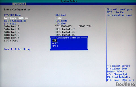 ÀåÄ¡ ºÎºÐ Áß Drive Configuration¿¡¼­´Â SATA ÀåÄ¡µéÀÇ ¼³Á¤À» ÇØÁÙ ¼ö Àִµ¥ ICH10RÀ» »ç¿ëÇϰí ÀÖ´Â ¸¸Å­ IDE/ AHCI/ RAIDÀÇ 3°¡Áö¸¦ ¼³Á¤ÇÒ ¼ö ÀÖ°í eSATA¸¦ »ç¿ëÇÒ ÁöÀÇ ¿©ºÎ¸¦ ¼±ÅÃÇÒ ¼ö ÀÖ´Ù.