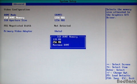 Advanced Áß Video Configuration¿¡¼­´Â ³»Àå ±×·¡ÇÈ ¸Þ¸ð¸®¿¡ »ç¿ëÇÒ ½Ã½ºÅÛ ¸Þ¸ð¸® ÇÒ´çÀ̳ª ÁÖ ºñµð¿À ¾î´ðÅ͸¦ ¼±ÅÃÇÏ´Â ¼³Á¤µéÀÌ °¡´ÉÇÏ´Ù. DVMT´Â ½Ã½ºÅÛ ¸Þ¸ð¸® ÇÒ´ç ºÎºÐÀ¸·Î 2D ÀÛ¾÷°ú 3D ÀÛ¾÷¿¡ µû¶ó ½Ã½ºÅÛ ¸Þ¸ð¸®¸¦ ÀûÀýÈ÷ Ȱ¿ëÇϸç, ±âº» 8MB·Î 2D ÀÛ¾÷À» ÁøÇàÇÏ°Ô µÈ´Ù. DVMT ¸ðµå´Â DVMT¿Í Fixed 2°¡Áö ¼³Á¤À» ÇÒ ¼ö ÀÖ´Ù. ½Ã½ºÅÛ ¸Þ¸ð¸® ÇÒ´çÀº 128MB/ 256MB/ Maximum DVMT (384MB)ÀÇ 3°¡Áö¸¦ ¼±ÅÃÇÏ¿© ½Ã½ºÅÛ ¸Þ¸ð¸®¸¦ °¡Á®¿Ã ¼ö ÀÖ´Ù. ÁÖ ºñµð¿À ¾î´ðÅÍ´Â Auto/ IGP/ PCIe ±×·¡ÇÈ Ä«µå/ PCI ±×·¡ÇÈ Ä«µå Áß Çϳª¸¦ ¼±ÅÃÇÒ ¼ö ÀÖ´Ù.