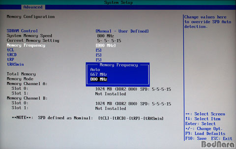 Chipset Configuration Áß Memory Configuration ¸Þ´º¿¡¼­´Â DDR ¸Þ¸ð¸®ÀÇ Å¬·°À» ¼³Á¤ÇÒ ¼ö Àִµ¥ G45´Â DDR2-667/ 800MHz¸¦ ¼±ÅÃÇÒ ¼ö ÀÖ´Ù. ¸Þ¸ð¸® ŸÀ̹ÖÀº tCL : Auto, 4/5/6/7, tRCD : Auto, 3/4/5/6/7, tRP : Auto, 3/4/5/6/7, tRASmin : Auto, 10/11/12/13/14/15¸¦ °¢°¢ ¼³Á¤ÇÒ ¼ö ÀÖ´Ù.