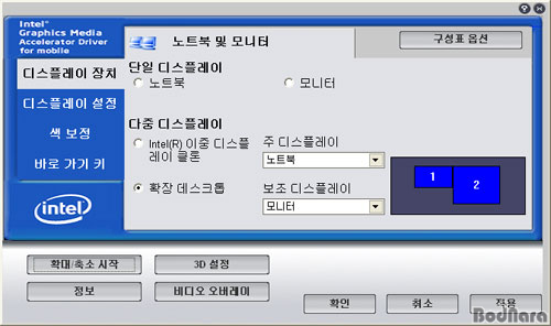 ³»Àå ±×·¡ÇÈ ±â´ÉÀ¸·Î ÀÎÅÚ GMA 950 ±×·¡ÇÈ Äھ µé¾î°¬´Âµ¥, D-SUB Ãâ·ÂÀ» ÅëÇØ¼­ ¿ÜºÎ ¸ð´ÏÅ͸¦ ¿¬°áÇØ ´ÙÁß µð½ºÇ÷¹ÀÌ ±¸¼ºÀ» Áö¿øÇÑ´Ù. ´ÙÁß µð½ºÇ÷¹ÀÌ ¸ðµå·Î´Â ¶È°°Àº È­¸éÀ» º¸¿©Áִ Ŭ·Ð ¸ðµå¿Í È®ÀåµÈ ÇØ»óµµ¸¦ Ç¥ÇöÇÏ´Â È®Àå µ¥½ºÅ©Åé ±â´ÉÀ» Á¦°øÇϸç, µð½ºÇ÷¹À̺°·Î »ö ǰÁú, ÇØ»óµµ, ÁÖ»çÀ², ȸÀü µîÀ» Á¶ÀýÇÒ ¼ö ÀÖ´Ù.