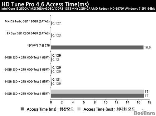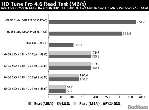 ¹Ù¶óÄí´Ù ±×¸°°ú EKMemory Real SSD C300 64GB·Î iSRT¸¦ ±¸¼ºÇÑ ÈÄ HD Tune Pro 4.6 Å×½ºÆ®¿¡¼ È®ÀÎÇßÀ» ¶§, µ¥ÀÌÅÍ Ä³½ÌÀÌ ÇÊ¿äÇÑ ±â¼úÀÇ Æ¯¼º»ó ù ¹øÂ° Å×½ºÆ®¿¡¼´Â Çϵåµð½ºÅ©¸¸ Å×½ºÆ®ÇßÀ» ¶§ º¸´Ù ¼º´ÉÀÌ ³·¾ÒÀ¸³ª ÀÌÈÄ ¼º´ÉÀÌ Çâ»óµÇ ÃÖÁ¾ÀûÀ¸·Î ¾à 70% °¡±îÀÌ Àб⠼º´ÉÀÌ Çâ»óµÆÀ¸¸ç, ij½Ì ÈÄ Çϵåµð½ºÅ©°¡ ¾Æ´Ñ SSD¿¡ ÀúÀåµÈ µ¥ÀÌÅ͸¦ ÀоîµéÀÌ°Ô µÇ¹Ç·Î ¿¢¼¼½º ŸÀÓ ¿ª½Ã SSD ¼öÁØÀ¸·Î »¡¶óÁ³´Ù.