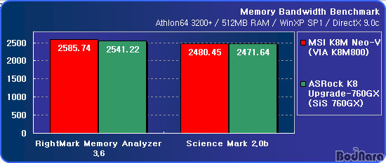 ¸Þ¸ð¸® ´ë¿ªÆøÀ» ÃøÁ¤Çϱâ À§ÇØ Sandra 2005¿Ü¿¡ RightMark Memory Analyzer 3.6°ú Science Mark 2.0 Beta µÎ°¡Áö ÇÁ·Î±×·¥À» »ç¿ëÇÑ °á°ú Sandra 2005¿Í ¸¶Âù°¡Áö·Î K8M800ÀÌ ¹Ì¼¼ÇÏ°Ô ³ôÀº °á°ú¸¦ ³ªÅ¸³Â´Ù.