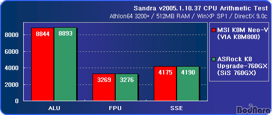 Sandra 2005ÀÇ CPU Arithmetic º¥Ä¡¸¶Å© °á°ú¸¦ º¸¸é SiS 760GX¸¦ »ç¿ëÇÑ K8 Upgrade-760GX º¸µå°¡ ±Ù¼ÒÇÏ°Ô ¾Õ¼­°í ÀÖ´Â °ÍÀ¸·Î ³ªÅ¸³­´Ù. ÇÏÁö¸¸ °ÅÀÇ ¿ÀÂ÷¹üÀ§¿¡ µé¾î°¡´Â Â÷ÀÌ¿¡ ºÒ°úÇÏ¿© Ưº°È÷ ¾î´À ÇÑÂÊÀÇ CPU ¼º´ÉÀÌ ¶³¾îÁöÁø ¾Ê´Â´Ù.