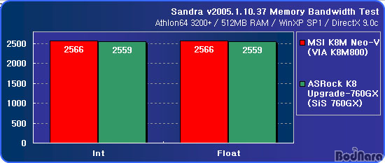 Sandra 2005ÀÇ ¸Þ¸ð¸® ´ë¿ªÆø ÃøÁ¤ °á°ú¸¦ ºñ±³Çغ¸¸é µÎ Á¦Ç° ¸ðµÎ ³»Àå ±×·¡ÇÈ ±â´É¿¡ ½Ã½ºÅÛ ¸Þ¸ð¸® ÀÏÁ¤ ºÎºÐÀ» ÇÒ´çÇϰí Àֱ⠶§¹®¿¡, ÀÏ¹Ý ¼ÒÄÏ 754 ¸ÞÀκ¸µåÀÇ ¸Þ¸ð¸® ´ë¿ªÆøº¸´Ù ¾à°£ ¶³¾îÁö´Â °ÍÀ» º¼ ¼ö ÀÖ´Ù. MSI K8M Neo-V°¡ ¾à°£ ´õ ³ôÀº °á°ú¸¦ º¸¿´´Âµ¥ ¹Ì¼¼ÇÑ FSB Ŭ·° Â÷À̰¡ ¹Ý¿µµÈ °ÍÀÏ ¼öµµ ÀÖ´Ù.