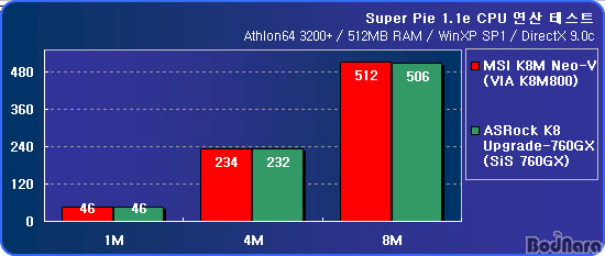 Super Pie 1.1e CPU ¿¬»ê Å×½ºÆ® °á°ú´Â K8 Upgrade-760GX°¡ ³·Àº CPU Ŭ·°¿¡µµ ºÒ±¸Çϰí 4M, 8M Ç׸ñ¿¡¼­ K8M800À» »ç¿ëÇÑ MSI K8M Neo-Vº¸´Ù ³ô°Ô ³ª¿Ô´Ù.