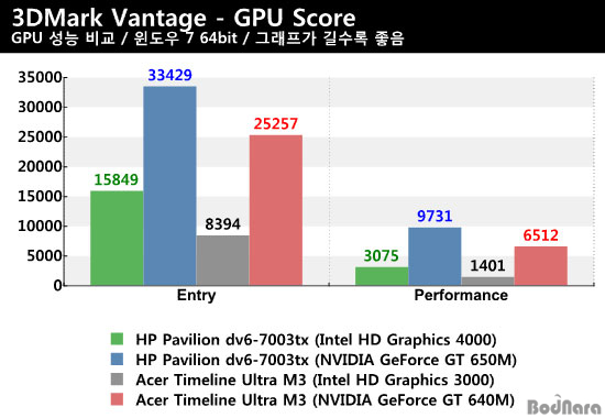 HP ÆÄºô¸®¿Â dv6-7003txÀÇ °æ¿ì Entry ¸ðµå Å×½ºÆ®¿¡¼´Â ±âº» ÀÎÅÚ ³»Àå ±×·¡ÇÈÀÇ 2¹è, Performance ¸ðµå Å×½ºÆ®´Â 3¹è ³ôÀº GPU ½ºÄھ ±â·ÏÇßÀ¸¸ç, À̺¸´Ù ¿ÜÀå ±×·¡ÇÈ »ç¾çÀÌ ³·Àº ¿¡À̼ ŸÀÓ¶óÀÎ ¿ïÆ®¶ó M3´Â Entry¿¡¼ 3¹è, Performance¿¡¼ 4.5¹è·Î ¼º´É Â÷À̰¡ ´õ ¹ú¾îÁ³´Ù.