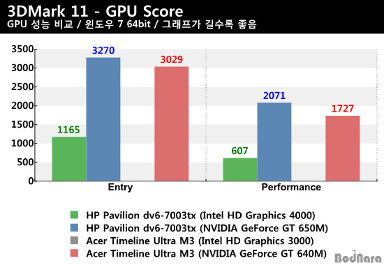3DMark11Àº ÀÎÅÚ HD ±×·¡ÇȽº 3000Àº DX11À» Áö¿øÇÏÁö ¾Ê¾Æ Å×½ºÆ® ÇÒ ¼ö ¾øÁö¸¸, HP ÆÄºô¸®¿Â dv6-7003tx¿¡ µé¾î°£ HD ±×·¡ÇȽº 4000¿¡¼´Â Á¤»óÀûÀÎ Å×½ºÆ®°¡ °¡´ÉÇÏ´Ù. ¿ÜÀå ±×·¡ÇÈÀ¸·Î Ãß°¡µÈ ¿£ºñµð¾Æ ÁöÆ÷½º GT 650M°ú ºñ±³Çؼ Entry ¸ðµå´Â ¾à 2.8¹è, Performance ¸ðµå´Â ¾à 3.4¹è ¼º´É Â÷À̸¦ º¸¿´´Ù.