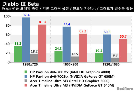 ÀÎÅÚ ³»Àå ±×·¡Çȸ¸À» »ç¿ëÇßÀ» ¶§´Â 1280x720 ÇØ»óµµ¿Í Low ±×·¡ÇÈ ¿É¼ÇÀ» ¼³Á¤ÇÏ°íµµ Æò±Õ ÇÁ·¹ÀÓÀÌ 50fps¿¡µµ ¹ÌÄ¡Áö ¸øÇß´ø HP ÆÄºô¸®¿Â dv6-7003txÁö¸¸, ¿ÉƼ¸Ó½º ±â¼ú·Î ¿ÜÀå ±×·¡ÇÈÀ» µ¿ÀÛ½Ã۸é 1920x1080ÀÇ ÃÖ´ë ÇØ»óµµ¿¡¼µµ Æò±Õ 60 ÇÁ·¹ÀÓ¿¡ À̸£·¯ µð¾Æºí·Î3¸¦ ³ëÆ®ºÏÀ¸·Î Áñ±â´Âµ¥µµ ¾Æ¹« ¹®Á¦°¡ ¾ø´Â °ÍÀ¸·Î ³ªÅ¸³µ´Ù.