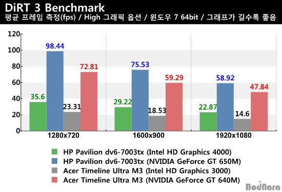 1920x1080 Ç®HD ÇØ»óµµ¸¦ Áö¿øÇÏ´Â HP ÆÄºô¸®¿Â dv6-7003txÀº µð½ºÇ÷¹ÀÌ ¿ø·¡ ÇØ»óµµ·Î °ÔÀÓÀ» ÇÏ·Á¸é ÀÎÅÚ HD ±×·¡ÇȽº 4000 ³»Àå ±×·¡ÇÈÀ¸·Î´Â 20 ÇÁ·¹ÀÓ´ë ÃʹÝÀ¸·Î ±×·¡ÇÈ ¿É¼ÇÀ» ´õ ³·Ãç¾ß ÇÑ´Ù. ±×·¯³ª ¿£ºñµð¾Æ ÁöÆ÷½º GT 650M ¿ÜÀå ±×·¡ÇÈÀ» »ç¿ëÇϸé Ç®HD ÇØ»óµµ¿¡¼ High ¿É¼ÇÀ» ¼³Á¤ÇÏ°íµµ 60 ÇÁ·¹ÀÓ ¼öÁØÀÇ ¿øÈ°ÇÑ °ÔÀÓ ÁøÇàÀÌ °¡´ÉÇÏ´Ù.