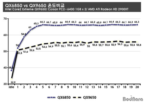 QX6850Àº IDE½Ã 38.3µµÀÇ ¿Âµµ¸¦ °¡Áö¸ç, QX9650Àº 32.9µµÀÇ ¿Âµµ¸¦ °¡Á® ¾à 5.4µµÀÇ ¿Âµµ Â÷À̸¦ °¡Áö´Â °ÍÀ¸·Î ³ªÅ¸³µ´Ù. ¶ÇÇÑ, Full Lod¸¦ ÅëÇØ 20ºÐ °£ÀÇ º¯È­¿¡¼­µµ ¾à 10.5µµÀÇ ¿Âµµ Â÷À̸¦ ³ªÅ¸³»¾î 45nm °øÁ¤ Àû¿ëÀ¸·Î ÀÎÇÑ ÀÌÁ¡À» ÃæºÐÈ÷ È®ÀÎÇÒ ¼ö ÀÖ´Â °á°ú¸¦ ¾òÀ» ¼ö ÀÖ¾ú´Ù.