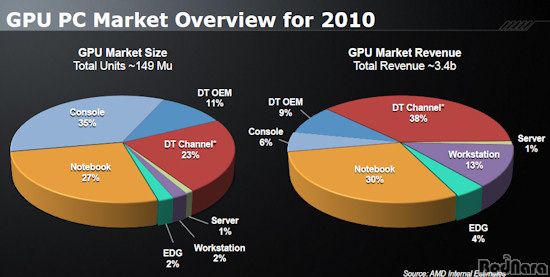 AMD ¶óµ¥¿Â HD 5800 ½Ã¸®Áî Ãâ½Ã¿¡ ¸ÂÃç ¹ßÇ¥Çß´ø AMD GPU »ç¾÷ ºÎ¹® ¼³¸í¿¡ ÀÇÇϸé Àüü GPU ½ÃÀå¿¡¼ µ¥½ºÅ©Å¾°ú ³ëÆ®ºÏ, ÄÜ¼Ö °ÔÀӱ⿡ µé¾î°¡´Â GPUÀÇ ÃâÇÏ·®Àº ºñ½ÁÇÏ°Ô º¸ÀÌÁö¸¸ ½ÇÁ¦ ÀÌ·Î ÀÎÇØ °ÅµÖµéÀÌ´Â ¸ÅÃâ (Revenue) ±Ô¸ð´Â µ¥½ºÅ©Å¾ ä³Î ½ÃÀå(¸®Å×ÀÏ ½ÃÀå)À̳ª ¿öÅ©½ºÅ×ÀÌ¼Ç ÂÊÀÌ ÃâÇÏ·®¿¡ ºñÇØ ¸ÅÃâ ÈξÀ Å« ÀÌÀÍÀ» ³»°í ÀÖ´Â °íºÎ°¡°¡Ä¡ ½ÃÀåÀÓÀ» ¾Ë·ÁÁØ´Ù.