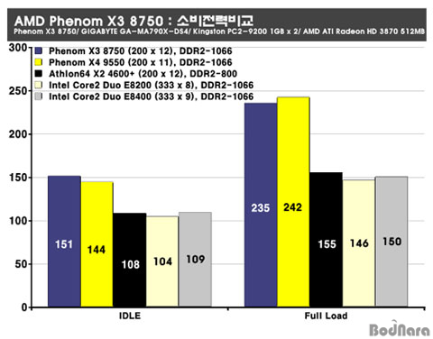 ±âÁ¸ Å×½ºÆ®µé°ú ¸¶Âù°¡Áö·Î IDLEÀº À©µµ¿ì ÁøÀÔ ÈÄ ¾Æ¹«·± ÀÛ¾÷À» ÇÏÁö ¾Ê¾ÒÀ» ¶§ÀÇ °á°úÀ̰í Full Load´Â À©µµ¿ì¿ë Stress PrimeÀ» Æ®¸®Çà ÄÚ¾î Á¦Ç°µé¿¡ ¸Â°Ô 3°³¸¦ ½ÇÇàÇÏ¿© 100% CPU Á¡À¯À²À» °¡Áø »óÅ¿¡¼­ÀÇ ÃÖ´ë ¼ÒºñÀü·ÂÀ» ÃøÁ¤ÇÏ¿´´Ù.