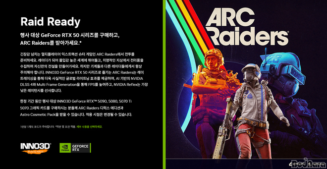 INNO3DÀÇ ±¹³» °ø½Ä À¯Åë»çÀÎ ¾ÆÀ̳ëºñ¾Æ´Â INNO3D GeForce RTX™ 5070 ÀÌ»ó ½Ã¸®Áî ±×·¡ÇÈÄ«µå ±¸¸Å °í°´À» ´ë»óÀ¸·Î ‘ARC Raiders’ µð·°½º ¿¡µð¼ÇÀ» ÁõÁ¤ÇÏ´Â ÇÁ·Î¸ð¼ÇÀ» ½Ç½ÃÇÑ´Ù°í ¹àÇû´Ù.