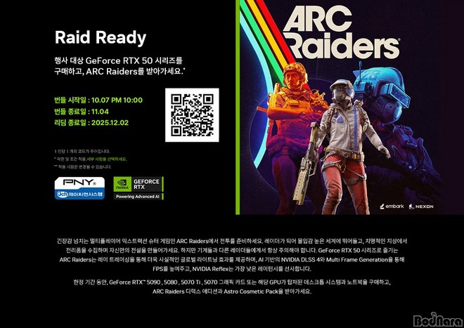 À̹ø °ÔÀÓ ¹øµé ÇÁ·Î¸ð¼ÇÀº Á¦À̾¾Çö½Ã½ºÅÛÀÌ À¯ÅëÇÏ´Â PNY ±×·¡ÇÈÄ«µå¸¦ ±¸¸ÅÇϸé Âü¿©°¡ °¡´ÉÇÏ´Ù. 2025³â 10¿ù 7ÀÏ ¿ÀÈÄ 10½Ã ÀÌÈÄ Á¦Ç°À» ±¸¸ÅÇÑ µÚ QRÄڵ带 ÅëÇØ ±¸±Û Æû ¸µÅ©¿¡ Á¢¼ÓÇÏ¿© ¾ç½Ä ÀÛ¼º ¹× ¿µ¼öÁõ »çÁøÀ» ¾÷·Îµå ÇÑ ÈÄ Á¦ÃâÇϸé ÇÁ·Î¸ð¼Ç ÁøÇà ´ã´çÀÚ°¡ È®ÀÎ ÈÄ °í°´¿¡°Ô "ARC Raiders" µð·°½º ¿¡µð¼Ç °ÔÀÓ Äڵ带 À̸ÞÀÏ·Î ¹ß¼ÛÇÏ°Ô µÇ¸ç, °í°´Àº NVIDIA APPÀ» ÅëÇØ Äڵ带 µî·ÏÇÏ¸é °ÔÀÓ ¸®µõ ÀýÂ÷´Â ¿Ï·áµÈ´Ù.